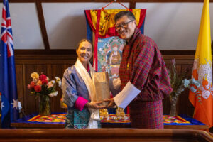 Ms. Booth’s connection with Bhutan goes back to the mid-1990s when she was undertaking research on the country. Her engagement with Bhutan deepened over the years, culminating in numerous visits to the country, including for the coronation of His Majesty The King in 2008. She has facilitated educational opportunities for Bhutanese through scholarships and coordinated important visits from Bhutan to Australia. During the Covid period, she facilitated the supply of PPEs from Australia to Bhutan. In 2022, she facilitated donations of fire uniforms from NSW Fire Service to Bhutan, and is coordinating fire management programs for Bhutan. More recently, she has helped a Bhutanese artist, Karma Tshering Wangchuk of Bhutan Street Fashion, to collaborate with a famous Australian photo editor to publish his book in Australia.