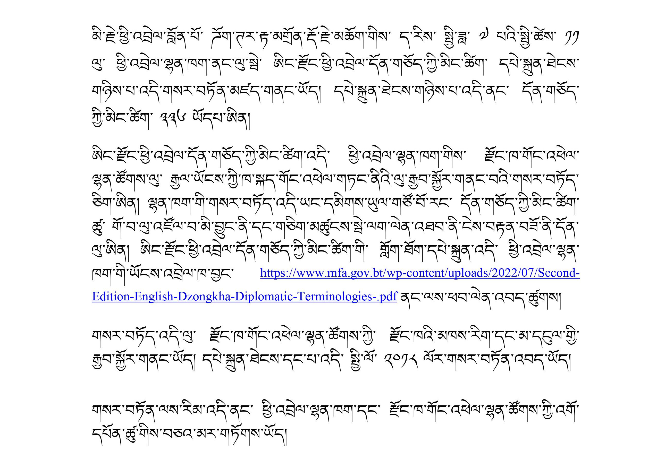 The English-Dzongkha Diplomatic Terminology is an initiative of the Ministry of Foreign Affairs to support the Dzongkha Development Commission to promote the national language. The objective of the initiative is to ensure correct understanding and uniformity in usage of the diplomatic terminology. The e-copy of the English-Dzongkha Diplomatic Terminology is available on the website of the Ministry of Foreign Affairs at https://www.mfa.gov.bt/wp-content/uploads/2022/07/Second-Edition-English-Dzongkha-Diplomatic-Terminologies-.pdf