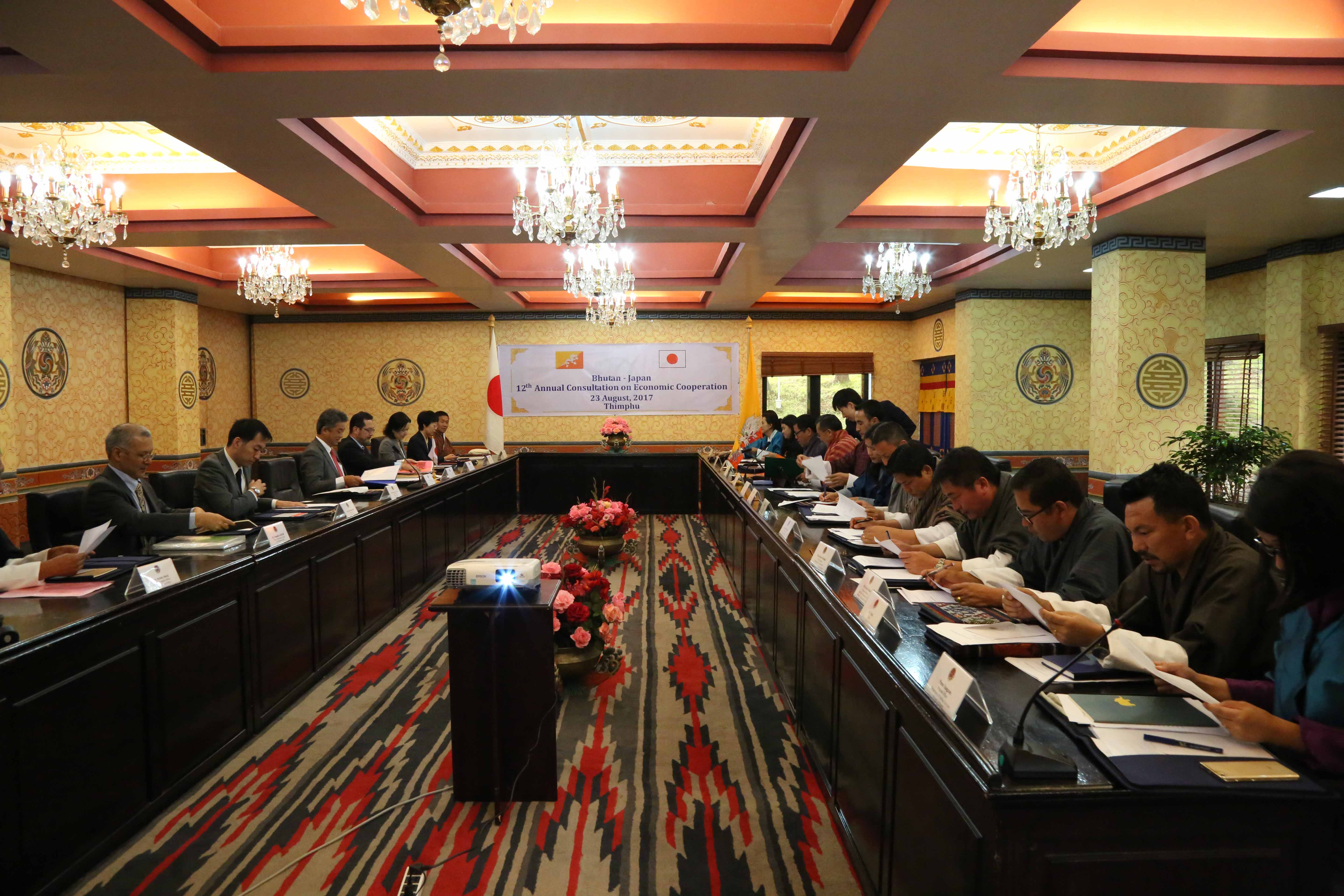 The 12th Annual Consultation on Economic Cooperation between Bhutan and Japan was held in Thimphu today, the 23rd of August 2017. Mr. Kenko SONE, Minister Counsellor for Economic & Development, Embassy of Japan in New Delhi led a 9 (nine) member delegation, comprising of officials from the Japanese Embassy in New Delhi and JICA Bhutan Office in Thimphu. Similarly, a 14 member Bhutanese delegation was led by Ambassador Kesang Wangdi, Director General of Bilateral Department, Ministry of Foreign Affairs.