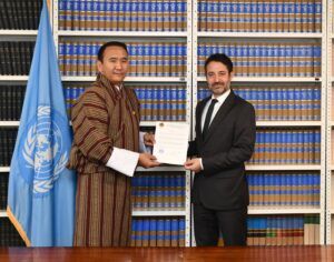 On behalf of the Royal Government of Bhutan, Mr Phuntsho Norbu, Chargé d’affaires, a.i., Permanent Mission of the Kingdom of Bhutan to the United Nations in New York during the deposit ceremony on 13 March 2024 handed over the original Instrument of Ratification of the Convention on the Rights of Persons with Disabilities (CRPD) to Mr David Nanopoulos, Chief of the Treaty Section, Office of Legal Affairs of the United Nations.