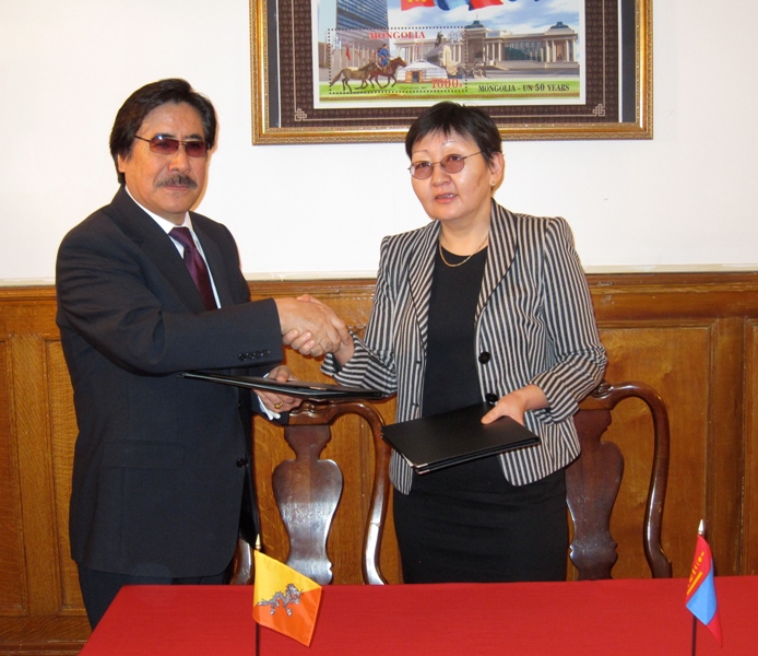 The Joint Communiqué on the establishment of diplomatic relations was signed between H.E. Mr. Lhatu Wangchuk, Ambassador and Permanent Representative of Bhutan to the United Nations in New York, and H.E. Ms. Enkhtsetseg Ochir, Ambassador and Permanent Representative of Mongolia to the United Nations in New York, on 18th January 2012, at the Permanent Mission of Mongolia in New York.