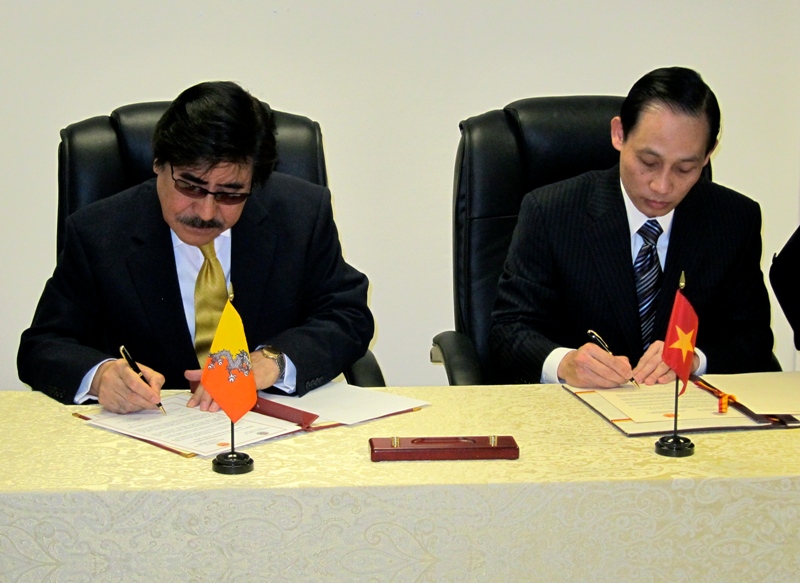 The Joint Communiqué on the establishment of diplomatic relations was signed between H.E. Mr. Lhatu Wangchuk, Ambassador and Permanent Representative of Bhutan to the United Nations in New York, and H.E. Mr. Le Hoai Trung, Ambassador and Permanent Representative of the Socialist Republic of Viet Nam to the United Nations in New York, on 19th January 2012, at the Permanent Mission of Viet Nam in New York.