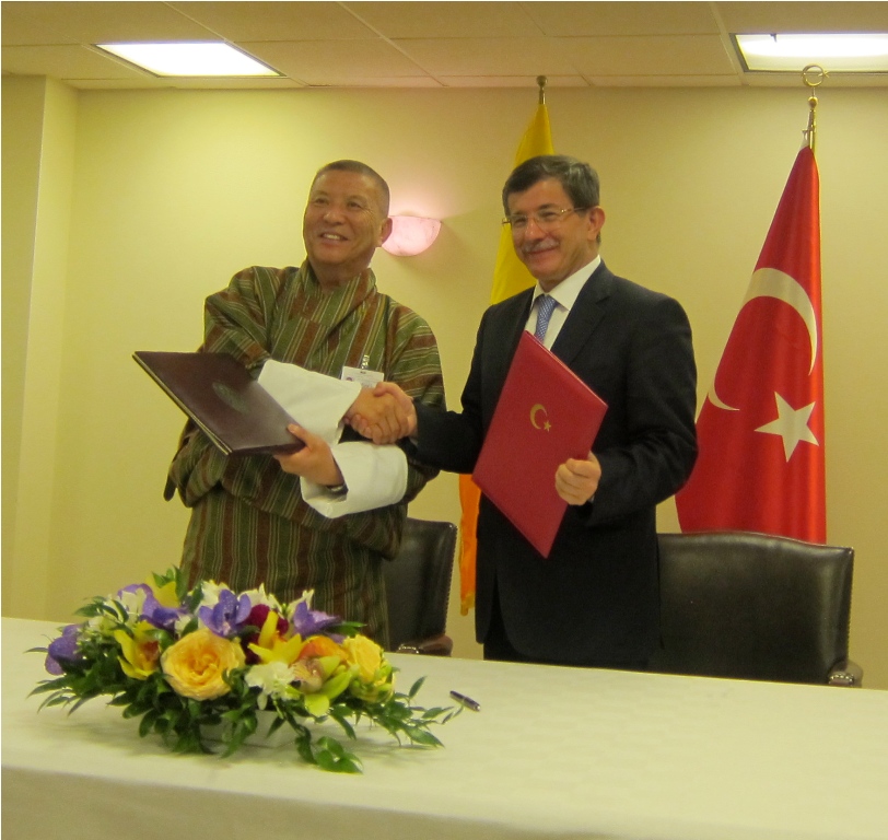 The Joint Communiqué on the establishment of diplomatic relations between Bhutan and the Republic of Turkey was signed between H.E. Lyonpo Khandu Wangchuk, Minister In-Charge for Foreign Affairs and H.E. Mr. Ahmet Davutoglu, Foreign Minister of the Republic of Turkey on 26th September 2012 at the Permanent Mission of Turkey to the United Nations in New York.