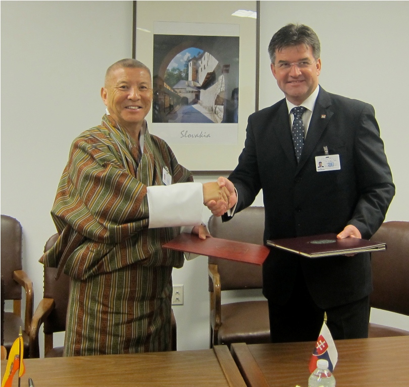 The Joint Communiqué on the establishment of diplomatic relations between Bhutan and the Slovak Republic was signed between H.E. Lyonpo Khandu Wangchuk, Minister-in-Charge for Foreign Affairs and H.E. Mr. Miroslav Lajcak, Deputy Prime Minister and Foreign Minister of Slovak Republic on 26th September 2012 at the United Nations in New York.