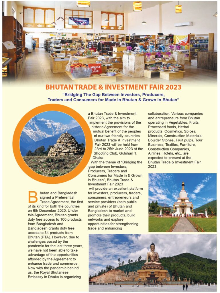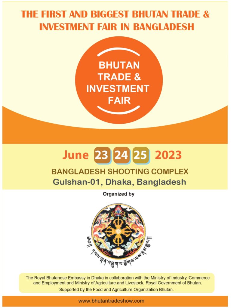 The Royal Bhutanese Embassy in Dhaka is organizing the First Bhutan Trade & Investment Fair 2023 from 23 – 25 June 2023 at the Shooting Club, Gulshan 1, Dhaka. The event is being organized in collaboration with the Ministry of Industry, Commerce and Employment, and the Ministry of Agriculture and Livestock, Royal Government of Bhutan, supported by the Bhutan Country Office of Food and Agriculture Organization.