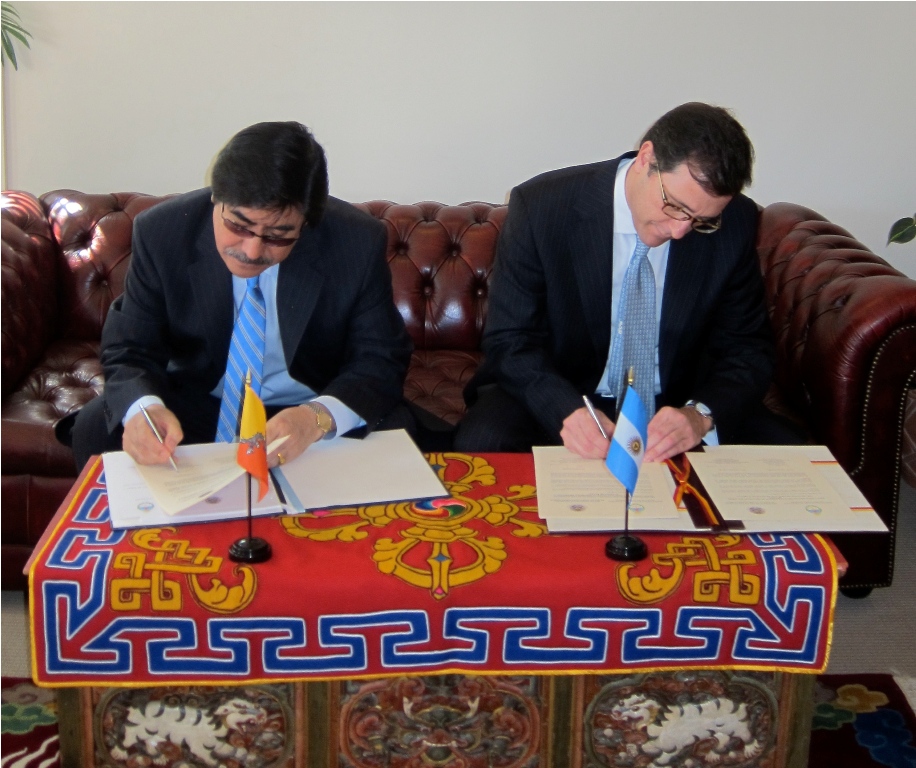 The Joint Communiqué on the establishment of diplomatic relations was signed between H.E. Mr. Lhatu Wangchuk, Ambassador and Permanent Representative of Bhutan to the United Nations in New York, and Mr. Mateo Estrémé, Minister Plenipotentiary and Chargé d’Affaires a.i of the Permanent Mission of Argentina to the United Nations in New York, on 14th March 2012, at the Permanent Mission of Bhutan in New York.