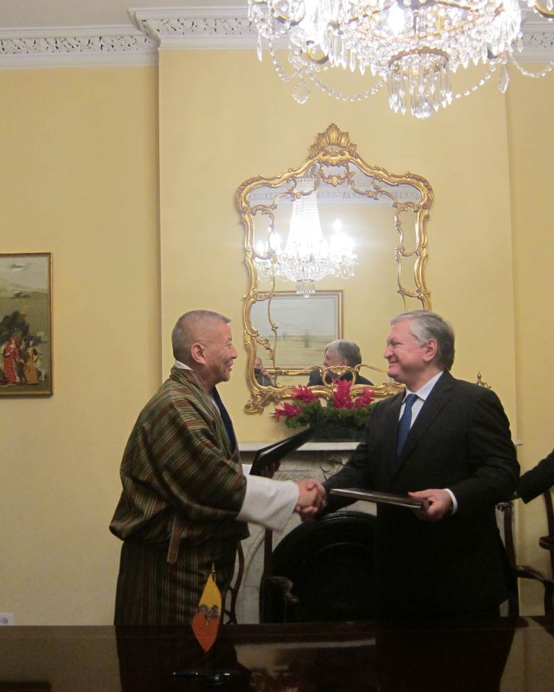 The Kingdom of Bhutan and the Republic of Armenia, wishing to strengthen and develop mutually beneficial relations between their countries and peoples, have established diplomatic relations with effect from 26th September 2012. The Joint Communiqué on the establishment of diplomatic relations was signed between H.E. Lyonpo Khandu Wangchuk, Minister In-Charge for Foreign Affairs and H.E. Mr. Edward Nalbandyan, Foreign Minister of the Republic of Armenia on 26th September 2012 at the Mission of Armenia in New York.