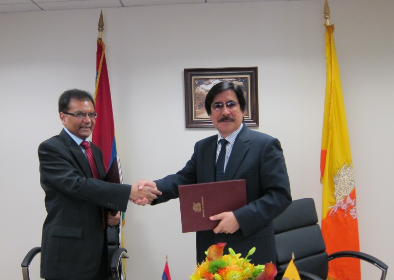 The Joint Communiqué on the establishment of diplomatic relations was signed between H.E. Mr. Lhatu Wangchuk, Ambassador and Permanent Representative of Bhutan to the United Nations in New York, and H.E. Mr. Milan Jaya Nyamrajsingh Meetarbhan, Ambassador and Permanent Representative of Mauritius to the United Nations in New York, on 2nd July 2012, at the Permanent Mission of Mauritius in New York.