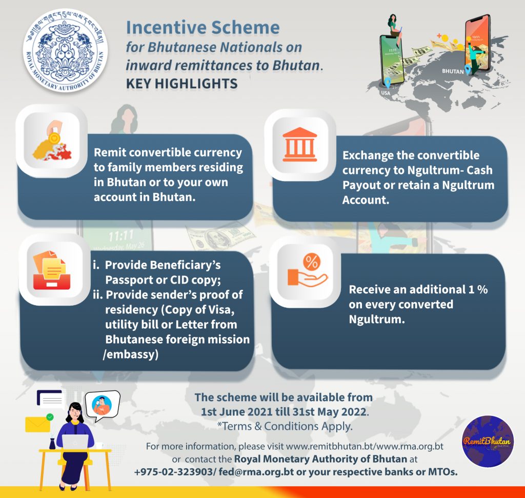 As per this scheme, the beneficiaries will receive a cash incentive of 1% (one percent) upon converting the remitted amount into Ngultrum using the prevailing/applicable exchange rates through the banking channel and the international money transfer operators. However, the incentive shall not be applicable for the remittances received for the purpose of foreign direct investments, donations, and trade, including remittances received in favour of non-governmental organizations, civil societies, and companies.