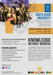 The South Asian University, based in New Delhi,  is inviting applications for Masters and PhD programmes for the academic year 2022-2023, beginning in July 2022.