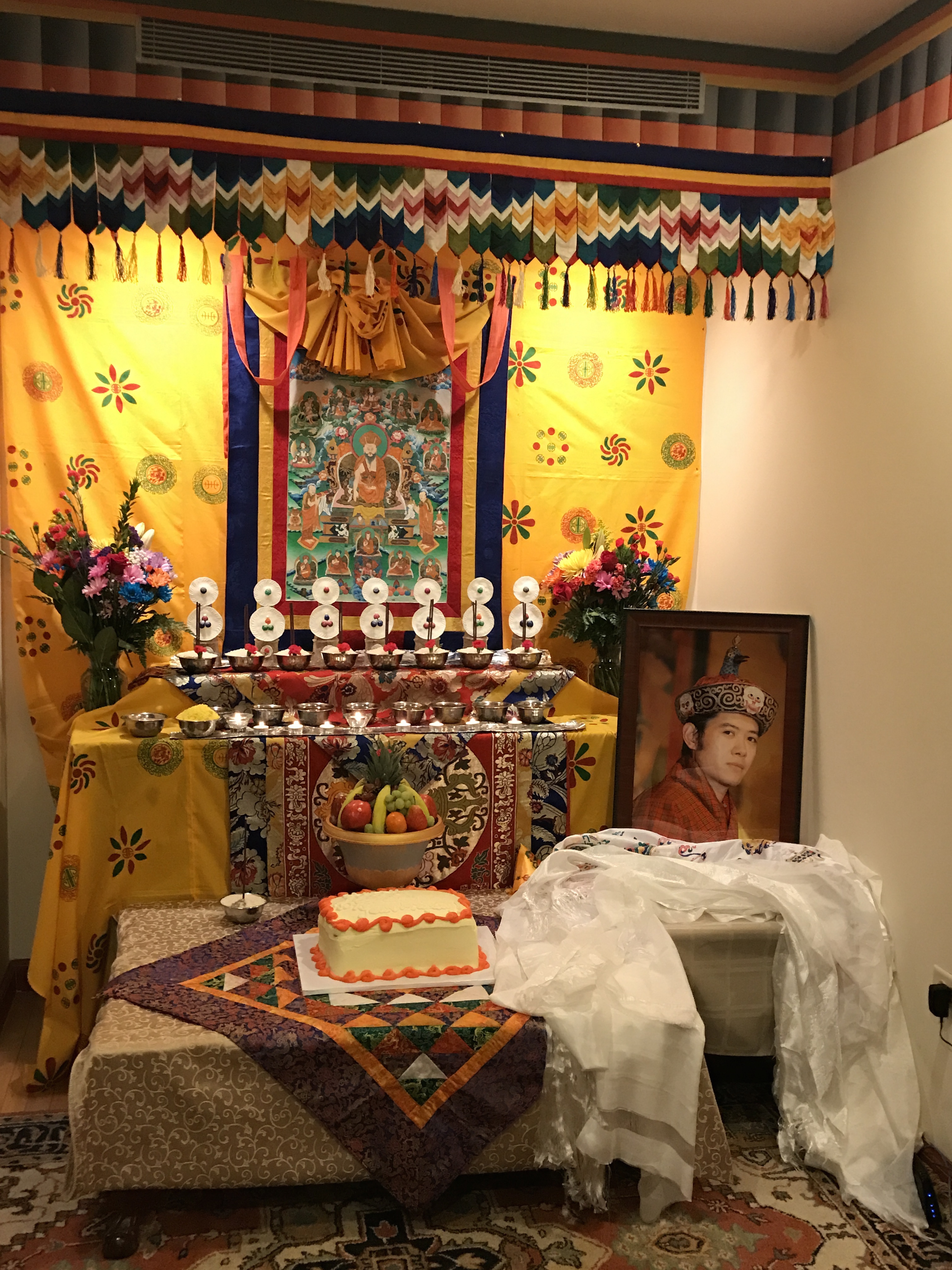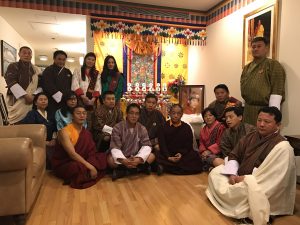The ceremony began with a special prayer ceremony at the Mission, during which prayers and Zhabten were offered for the long life, good health and happiness of His Majesty the King and Her Majesty the Gyaltsuen, His Majesty the Fourth King, His Royal Highness the Gyalsey and the members of the Royal Family. Hon’ble Chairperson of National Council, Thrizin Dasho Sonam Kinga, Hon’ble Member of Parliament, Dasho Tashi Phuntsho and Kutshab, Officers and Staff of the Mission, including their spouses, participated in the prayer ceremony.