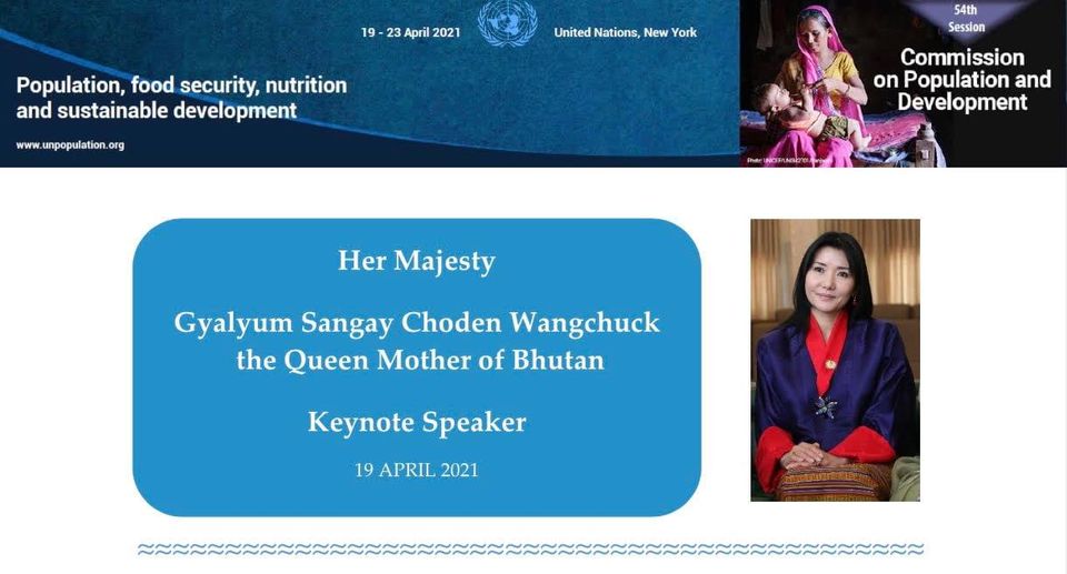 Her Majesty The Queen Mother Gyalyum Sangay Choden Wangchuck will be delivering the keynote address at the 54th session of the Commission on Population and Development that will be held at the United Nations Headquarters in New York from 19 to 23 April 2021. Her Majesty’s keynote address will be delivered via a pre-recorded video statement during the opening of the session on 19 April 2021 which will begin at 8pm BST.The Commission on Population and Development (CPD) monitors, reviews and assesses the implementation of the Programme of Action of the 1994 International Conference on Population and Development. It contributes to the follow-up and review of the 2030 Agenda for Sustainable Development. The special theme of the session this year is “Population, food security, nutrition and sustainable development”.