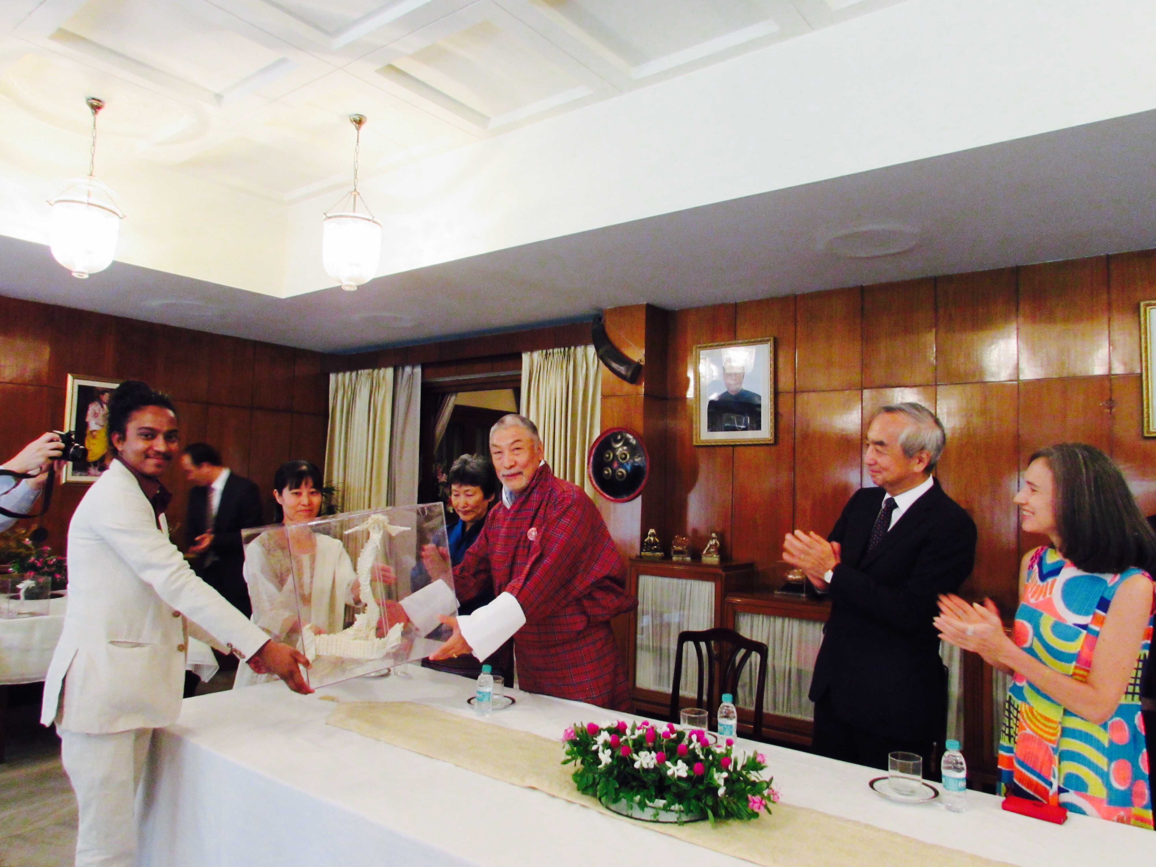 As part of the 30th Anniversary Celebrations on the establishment of diplomatic relations between Bhutan and Japan, Origami Oritai presented two Origami dragons to His Excellency Ambassador V. Namgyel. His Excellency Ambassador Kenji Hiramatsu and Madam Patricia Hiramatsu were also present during the event.