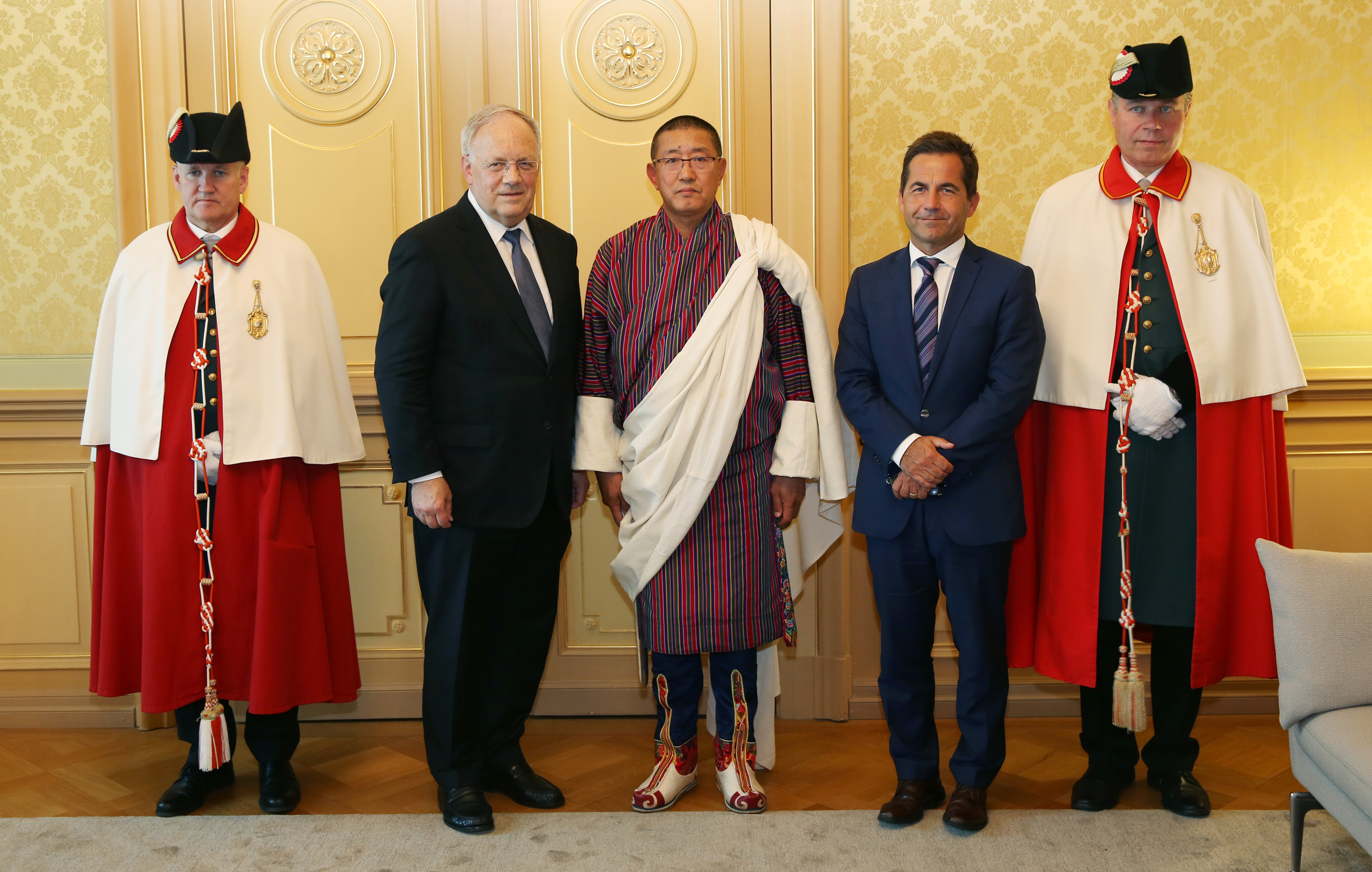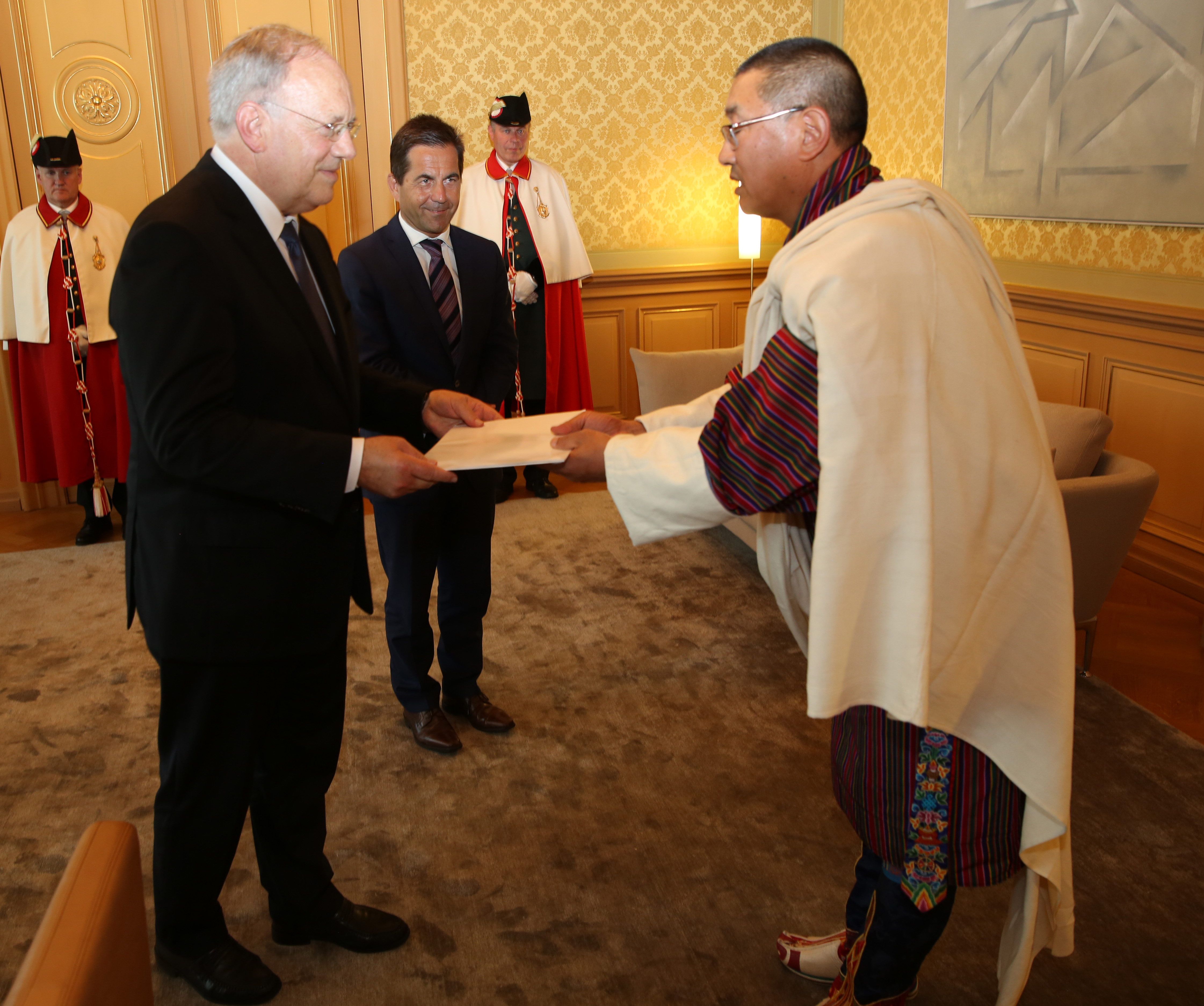 On 23rd June 2016, Ambassador Kinga Singye presented his credentials to the President of the Swiss Confederation, H.E. Mr. Johann N. Schneider-Ammann, at the Federal Palace in Bern accrediting him as the Ambassador Extraordinary and Plenipotentiary of Bhutan to Switzerland with residence in Geneva.