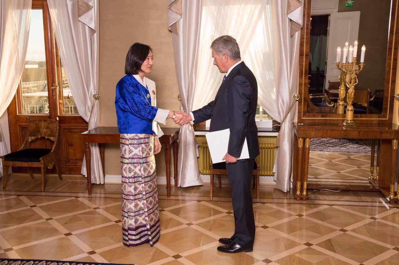 On 1st December 2016, Ambassador Pema Choden presented her Letter of Credence to H.E. Mr. Sauli Niinistö, President of the Republic of Finland accrediting her as Ambassador of the Kingdom of Bhutan to the Republic of Finland at the Presidential Palace in Helsinki.