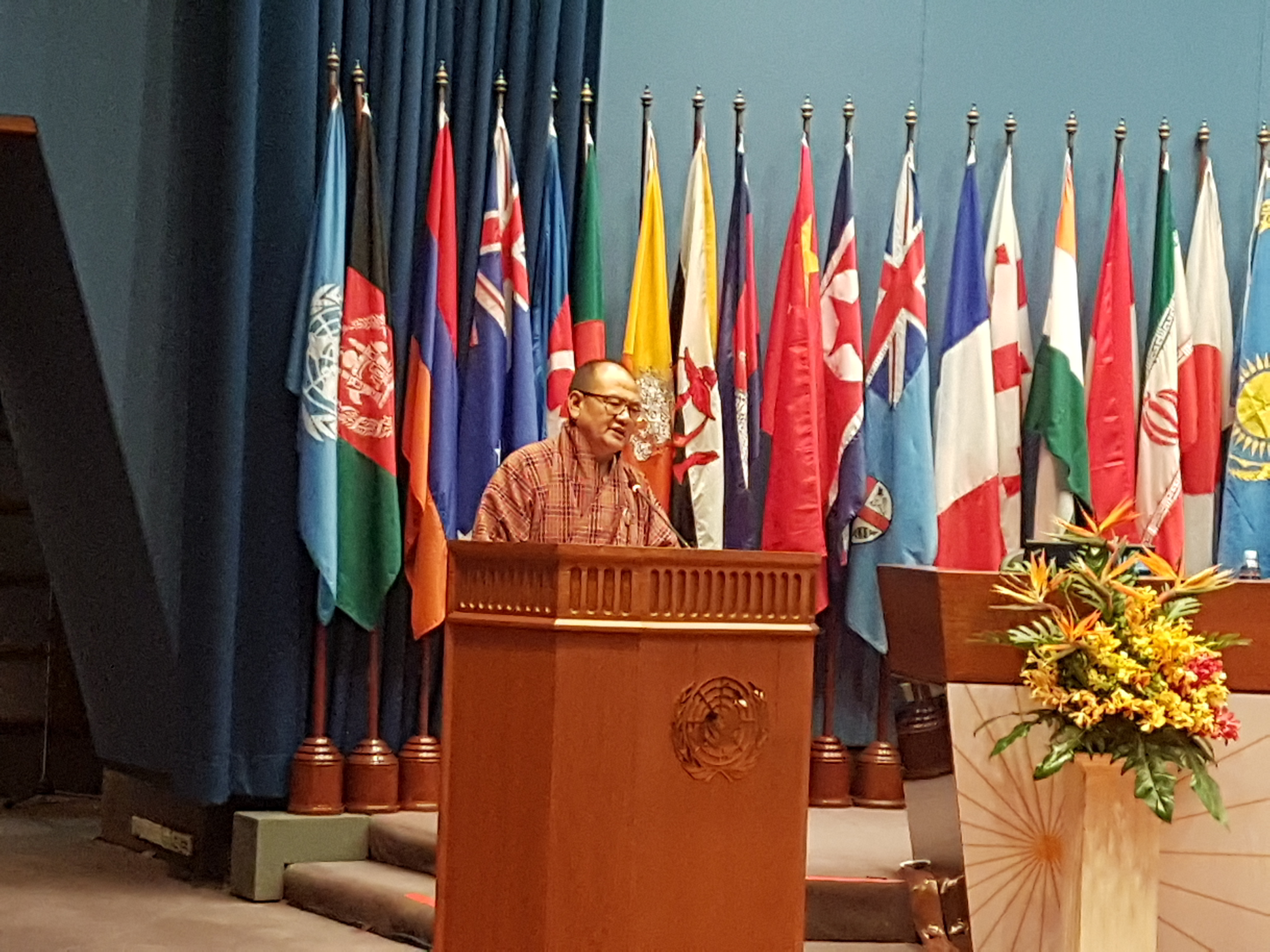 Leading Bhutan’s delegation to the 73rd Session of the Economic and Social Commission for Asia and the Pacific in Bangkok, Foreign Secretary Sonam Tshong addressed the Ministerial Segment on 18th May 2017. Marking the occasion of the 70th anniversary of the establishment of the Regional Commission, he said that UN ESCAP has advanced regional economic prosperity to eradicate poverty and inequalities through coordinated action. He acknowledged ESCAPβs role as an essential arm of the UN system, providing global context to regional and national efforts. [Full text of statement attached.
