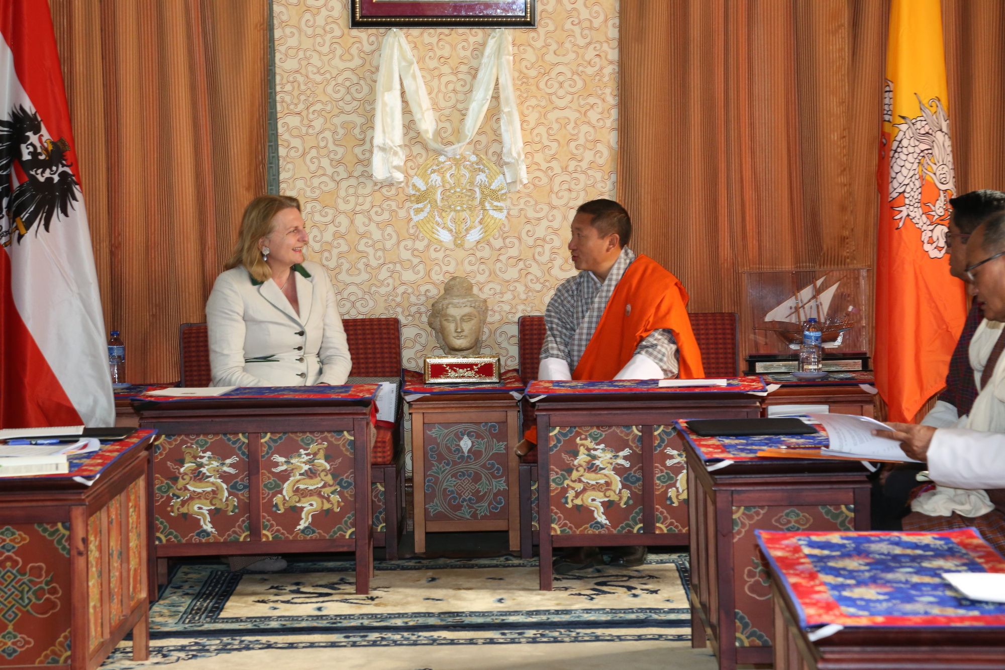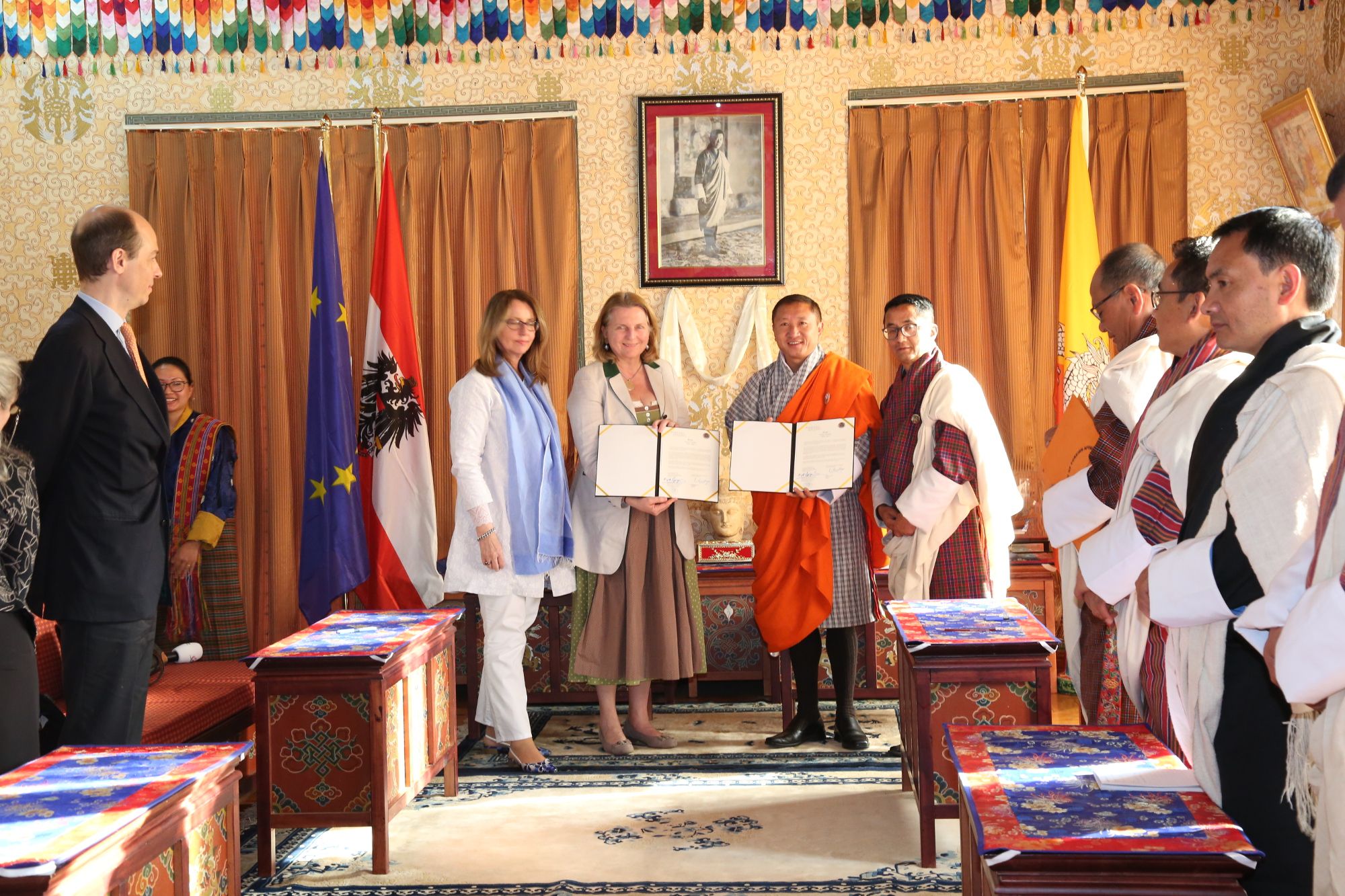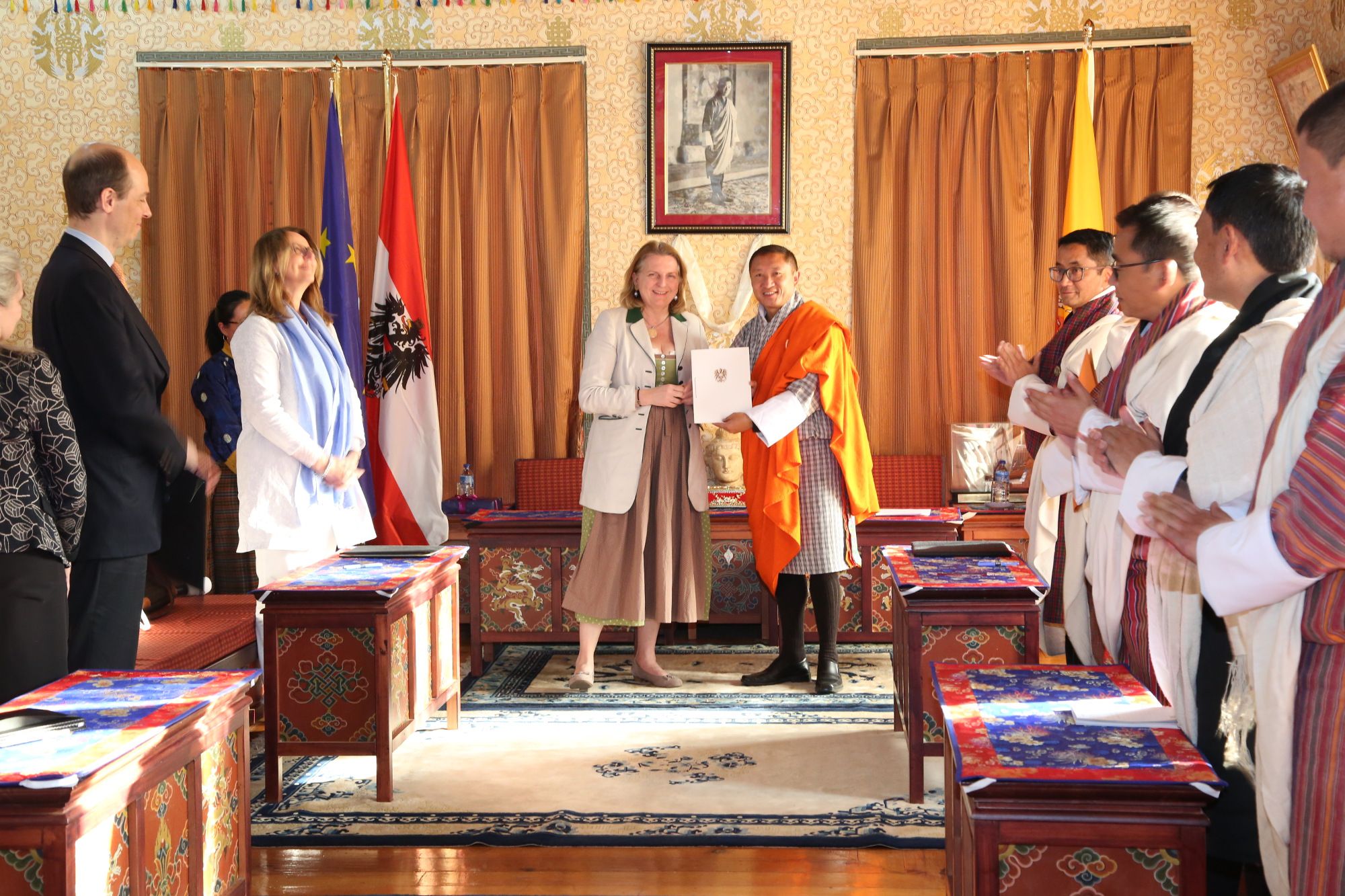 Mr. Thinlay Namgyel, Secretary, Gross National Happiness Commission and H.E. Ms. Brigitte Oeppinger-Walchshofer, Ambassador of Austria to Bhutan based in New Delhi, signed the letter of exchange for the Bhutan Country Strategy 2019-2023. The signing took place in the presence of H.E Lyonpo (Dr.) Tandi Dorji, the Foreign Minister of Bhutan and H.E. Dr. Karin Kneissl, Minister for Europe, Integration and Foreign Affairs of Austria. H.E Dr. Kneissl is on a two day visit to Bhutan, accompanied by senior officials from the Austrian government.