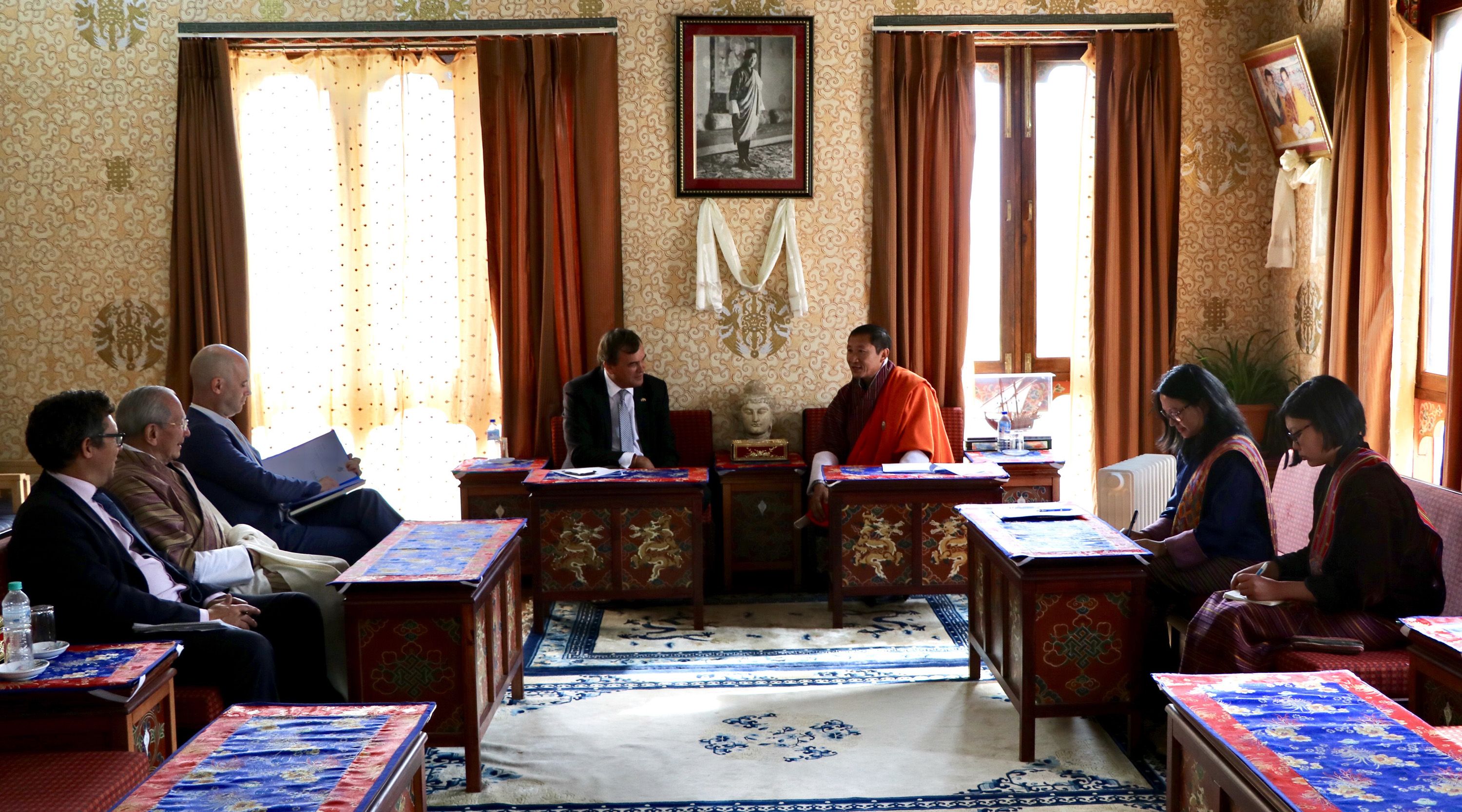 The High Commissioner of the United Kingdom to India, The Honourable Sir Dominic Asquith KCMG, called on the Foreign Minister Lyonpo (Dr.) Tandi Dorji on 25th March in the Gyalyong Tshokhang. The two sides discussed issues of mutual interest in areas such as education, health and foreign policy. The High Commissioner was on an official visit to Bhutan from 25-27 March to promote the Chevening Scholarship and to launch the Fleming Fund Grant Programme in Bhutan. The first Fleming Fund Country