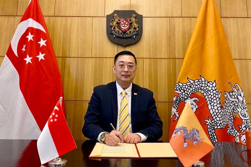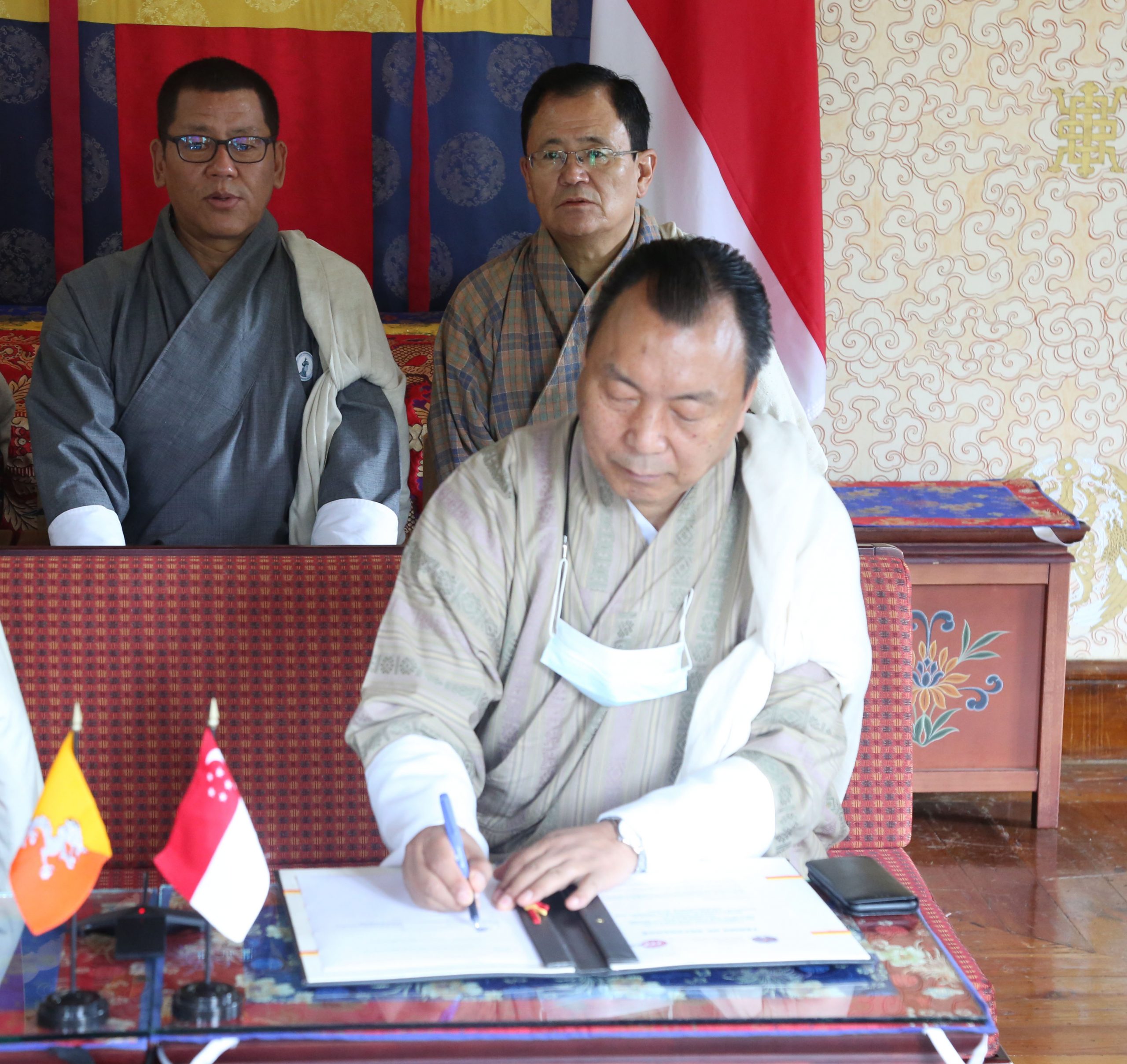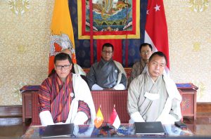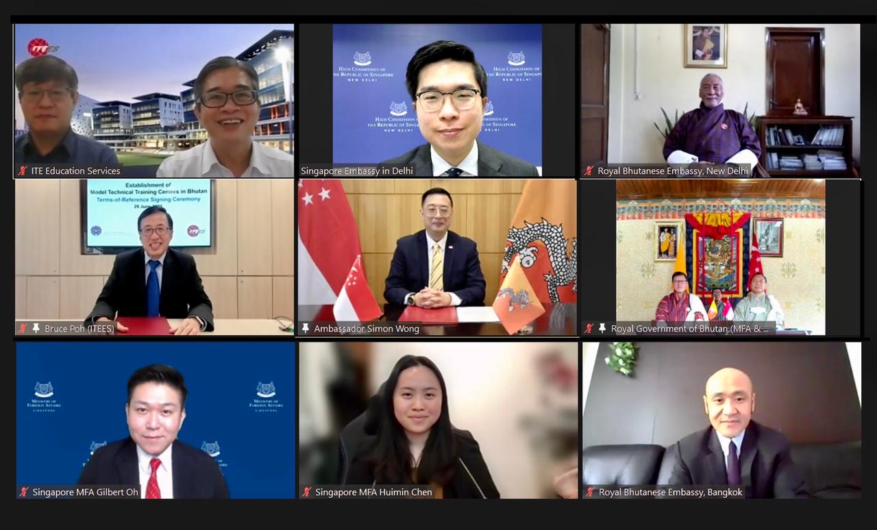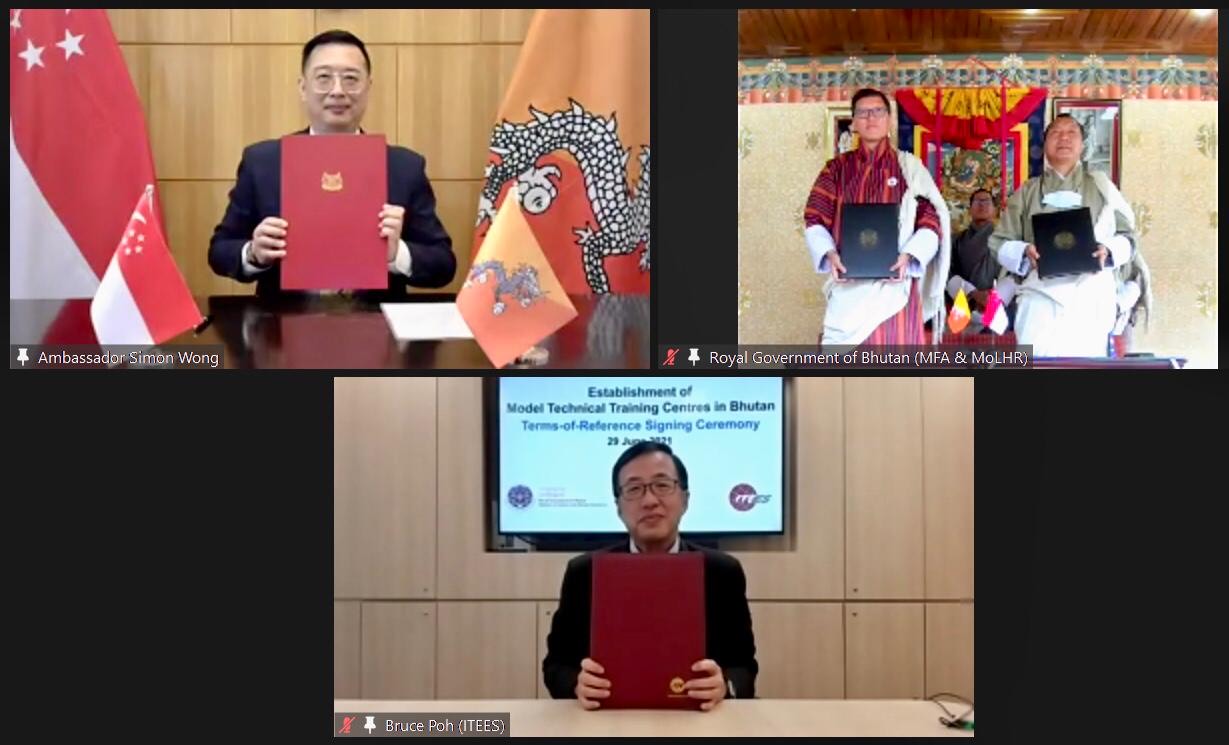 Mr. Sonam Tobgay, Director, Department of Bilateral Affairs, Ministry of Foreign Affairs, and H.E. Mr. Simon Wong, Ambassador of Singapore to Bhutan in New Delhi signed a Memorandum of Understanding (MoU) virtually on the Establishment of Model Technical Training Centres (MTTC) in the Technical Training Institute of Thimphu and Technical Training Institute of Khuruthang on 29 June 2021.