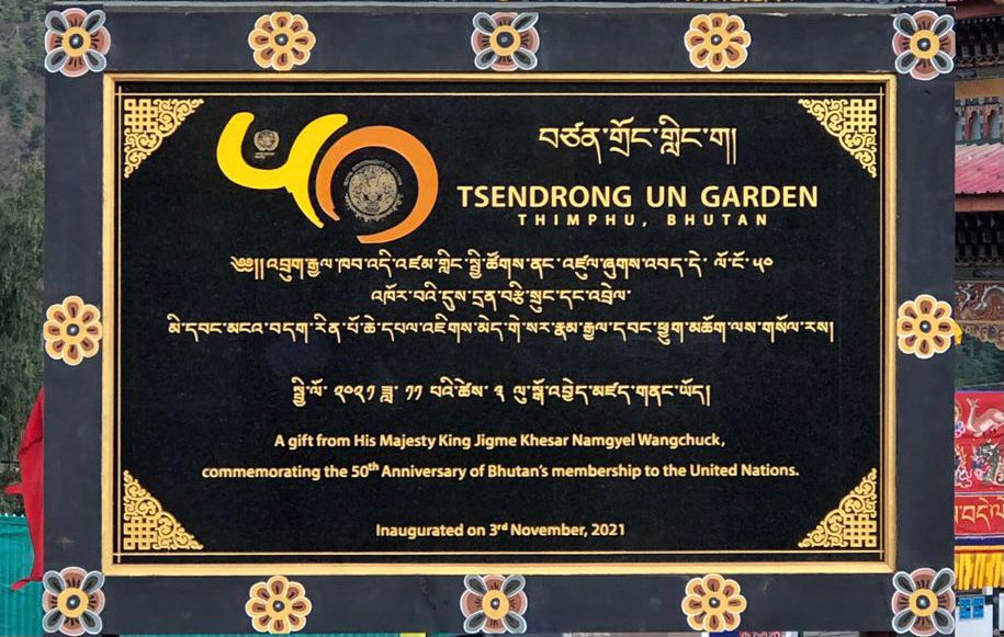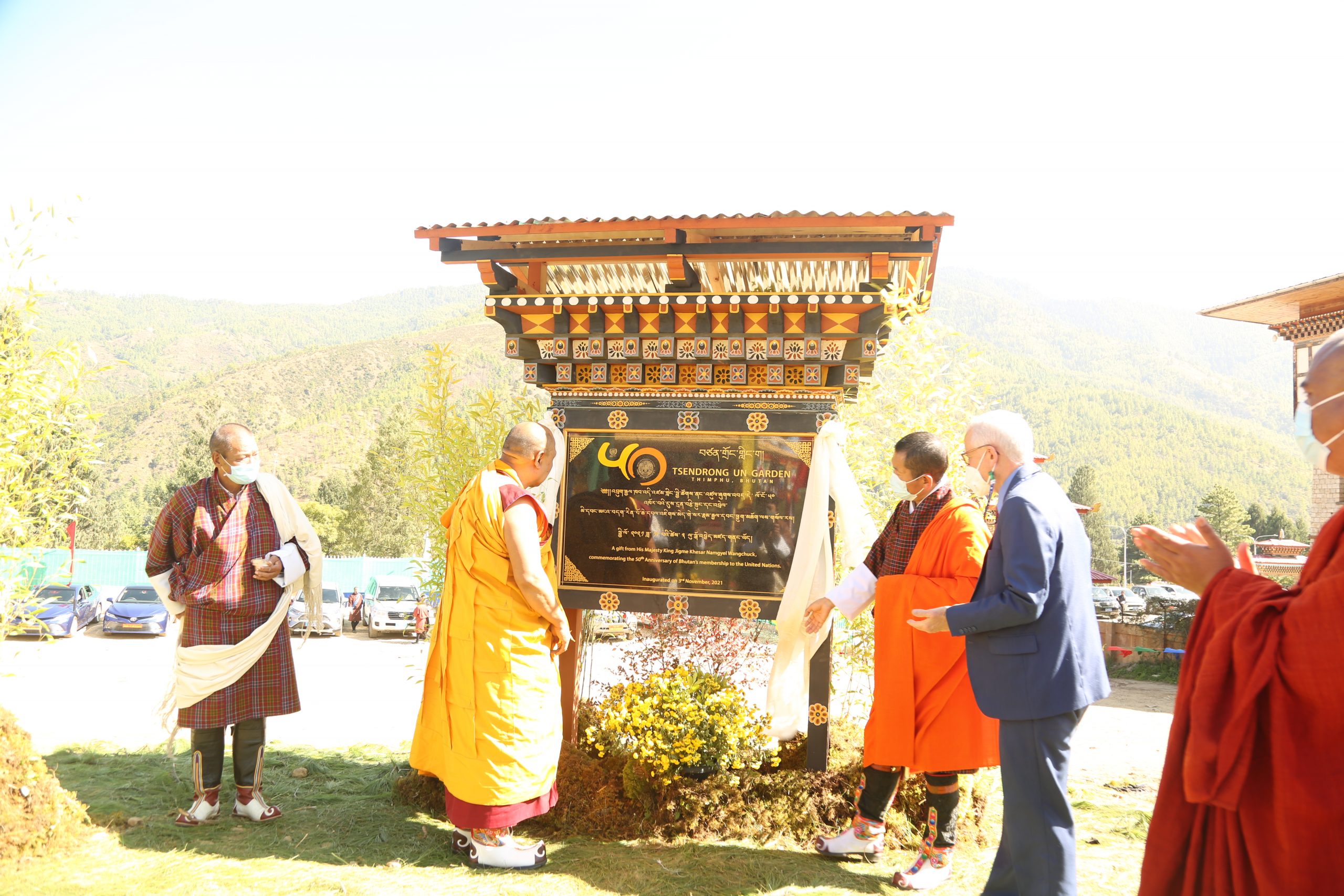 The Salang Tendrel (ground-breaking) ceremony for the Tsendrong UN Garden was held at 11 am on the 3rd of November, 2021 corresponding to the 29th Day of the Iron Female Ox Year of the Bhutanese calendar. The Garden is a gift from His Majesty The King and is dedicated to the 50th Anniversary of Bhutan’s Membership to the UN. Bhutan’s admission as the 128th member-state of the United Nations in 1971 was a significant milestone in the country’s history as it reinforced Bhutan’s status as a sovereign nation and marked our entry into the larger comity of nations.