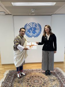 Ambassador Tenzin Rondel Wangchuk presented his credentials to H.E. Ms. Ghada Fadhi Waly, Director-General of the United Nations Office in Vienna (UNOV) and Executive Director of the United Nations Office for Drugs and Crime (UNODC) on Thursday, 19 November 2021 at the UN Office in Vienna. Ambassador Tenzin Rondel Wanghcuk is accredited as the Permanent Representative of Bhutan to the United Nations Office and other specialized UN agencies in Vienna.
