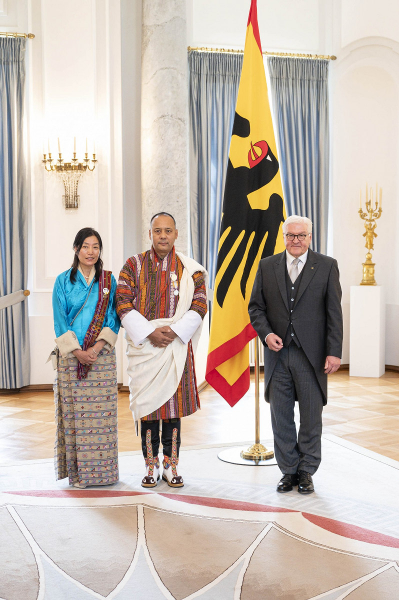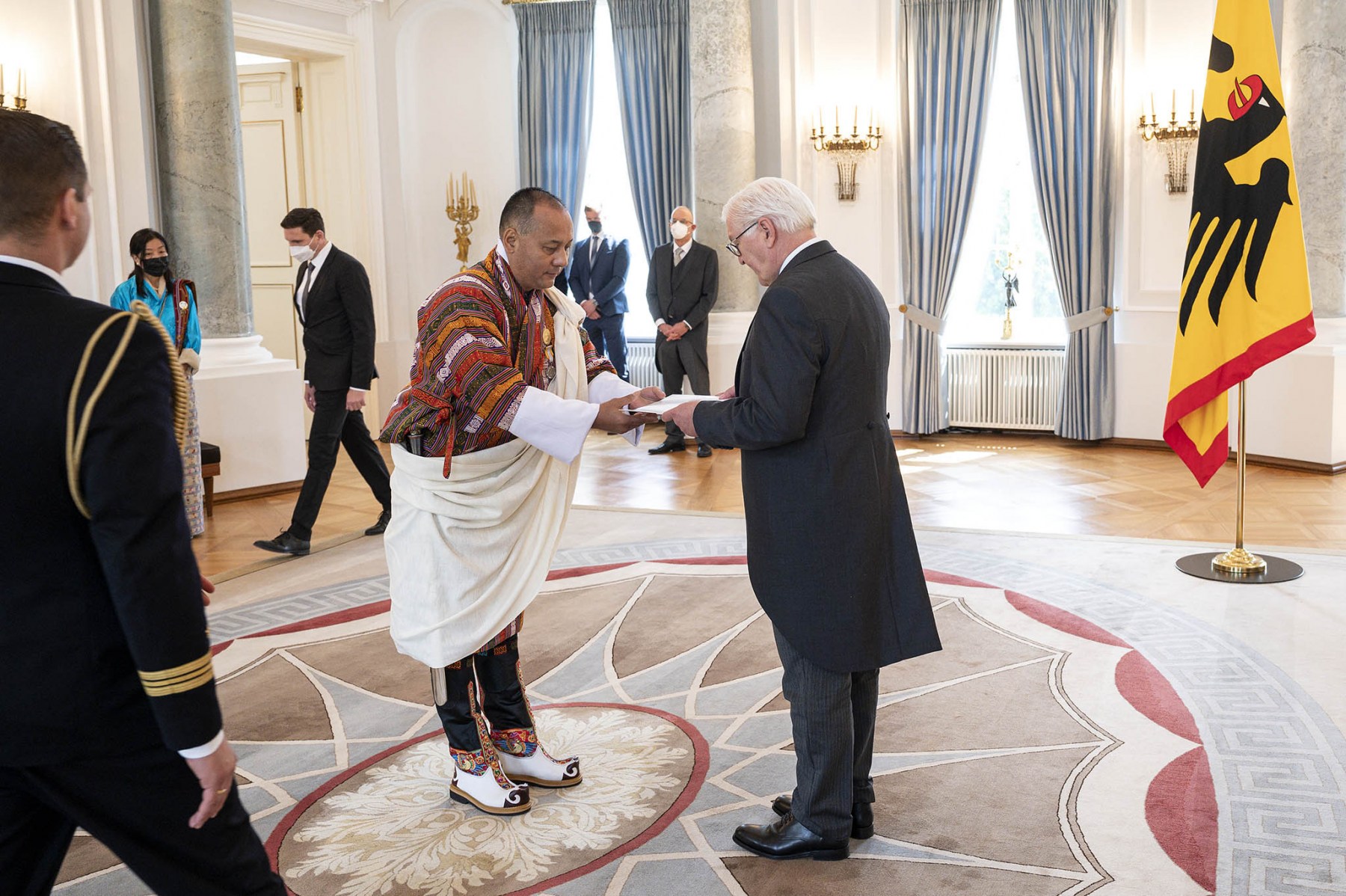Kutshab Tshering Gyaltshen Penjor presented his Letters of Credence to Federal President Frank-Walter Steinmeier of the Federal Republic of Germany at Schloss Bellevue in Berlin on 5th May 2022, accrediting him as the First Ambassador Extraordinary and Plenipotentiary of the Kingdom of Bhutan to the Federal Republic of Germany.