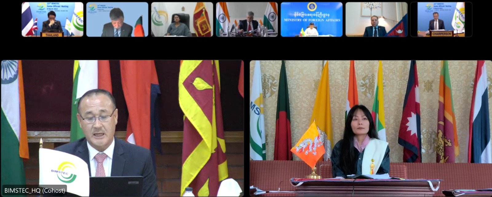 The Twenty Third Session of the BIMSTEC Senior Officials’ Meeting (SOM) was held on 8 March 2023. The Bhutanese delegation was led by Officiating Foreign Secretary Tshoki Choden. The meeting was hosted virtually by the Government of Thailand, as the chair of BIMSTEC.