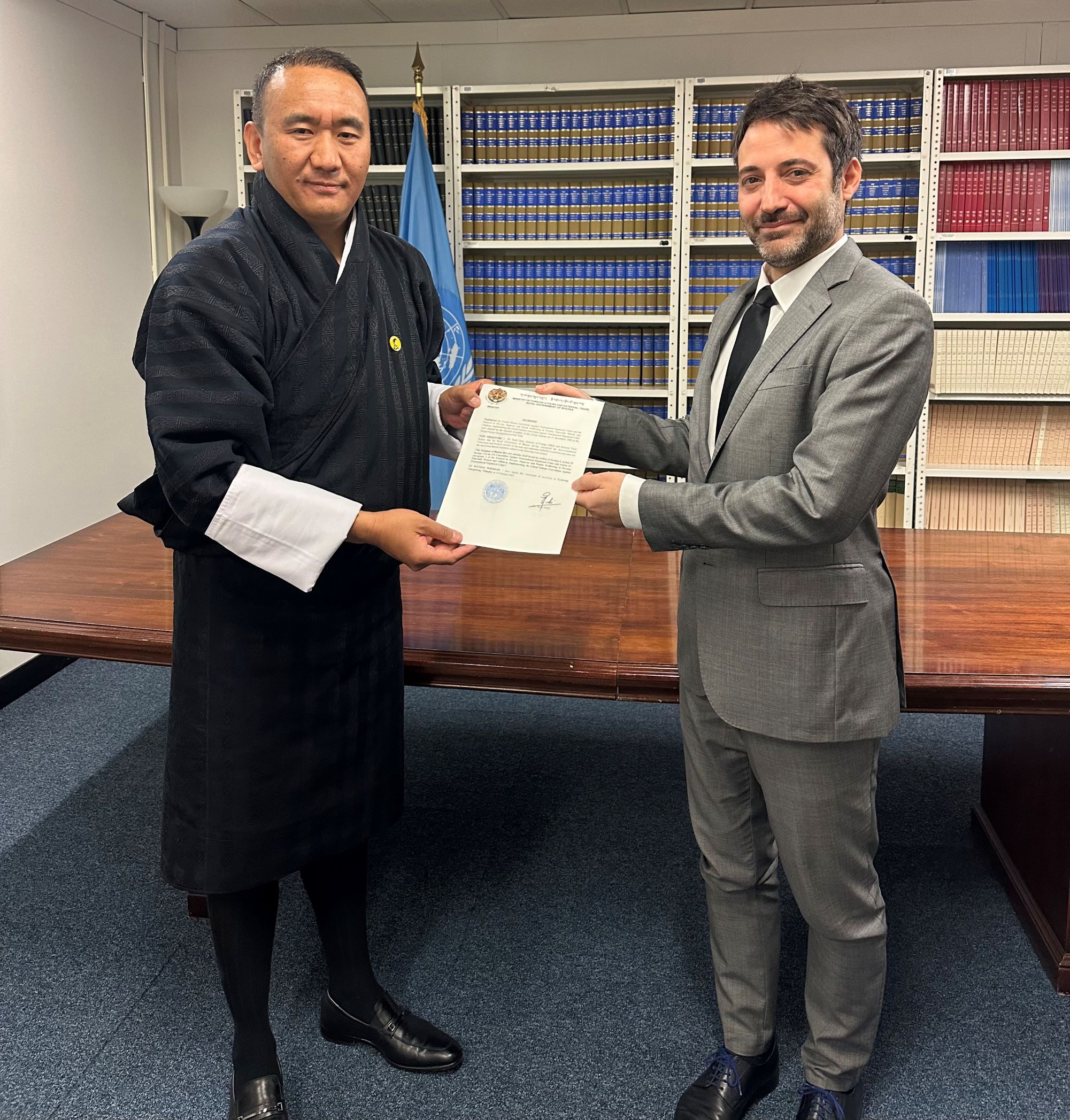 On behalf of the Royal Government of Bhutan, Mr. Phuntsho Norbu, Chargé d’affaires, a.i. at the Permanent Mission of Bhutan to the United Nations in New York handed over the original Instrument of Ratification of Bhutan’s accession to the United Nations Convention Against Transnational Organized Crime and its Protocol to Prevent, Suppress and Punish, Trafficking in Persons, Especially Women and Children to Mr. David Nanopoulos, Chief of the Treaty Section at the Office of Legal Affairs of the United Nations on 21 March 2023.