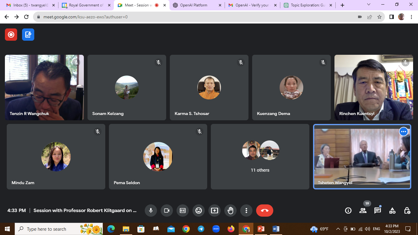 At the invitation of the Ministry of Foreign Affairs and External Trade, Professor Robert Klitgaard conducted a session with officials of the Ministry on ChatGPT and its applications on 2 October 2023 at the Ministry in a mixed mode session. Officials from Bhutan’s Embassies, Missions and Consulates abroad also attended the session.