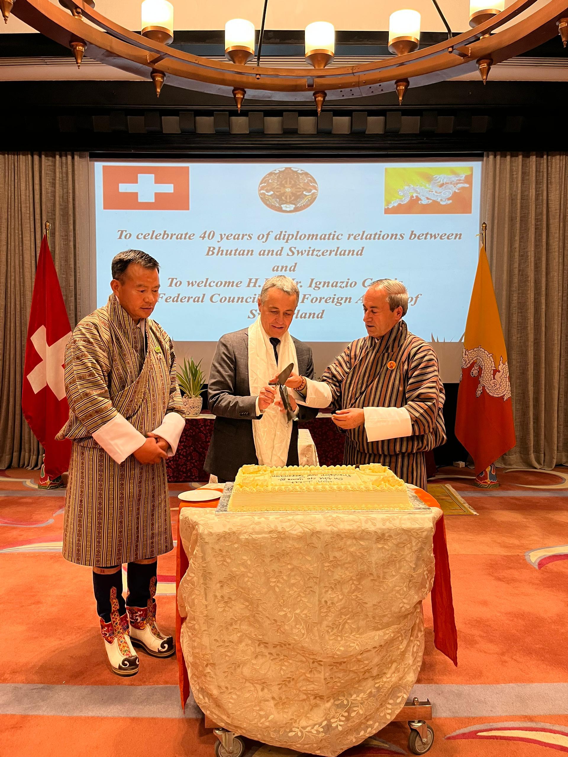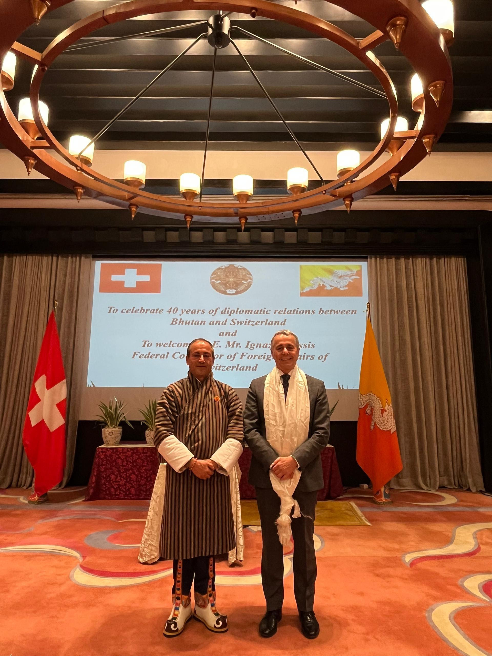 On 08 July 2025, Lyonpo D.N. Dhungyel, Minister for the Ministry of Foreign Affairs and External Trade hosted a reception in commemoration of 40 years of diplomatic relations between Bhutan and Switzerland and to welcome H.E. Mr. Ignazio Cassis, Federal Councillor and Head of the Federal Department of Foreign Affairs, Swiss Confederation to Bhutan.