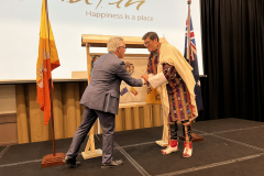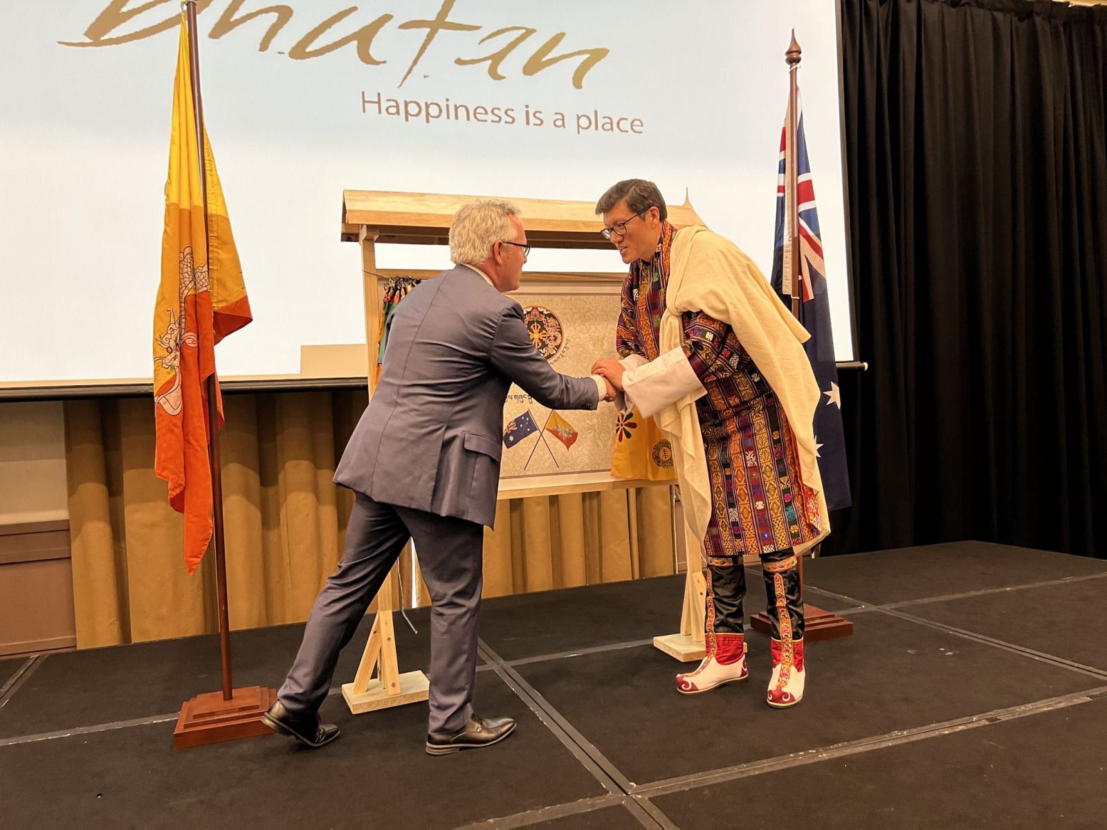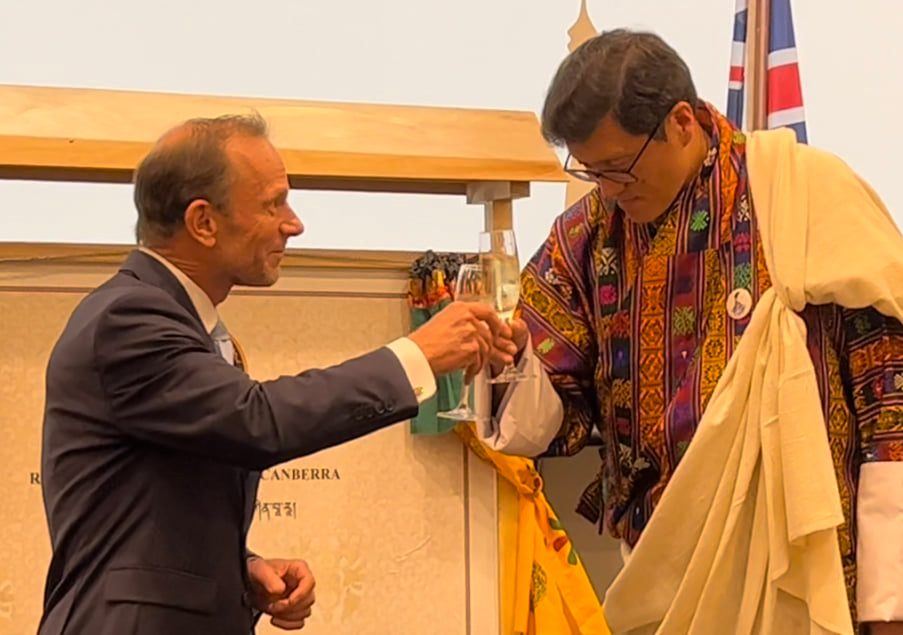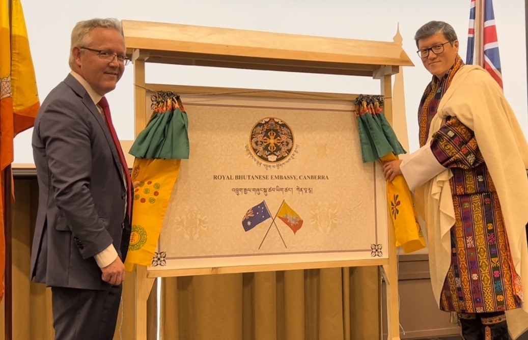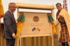 Mr. David Smith, Federal Member for Bean and Ambassador Sonam Tobgay unfurls the plaque in a symbolic gesture to mark the official opening of the Embassy.