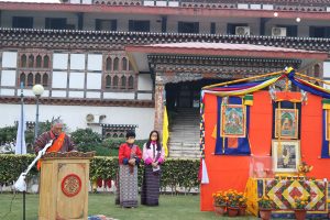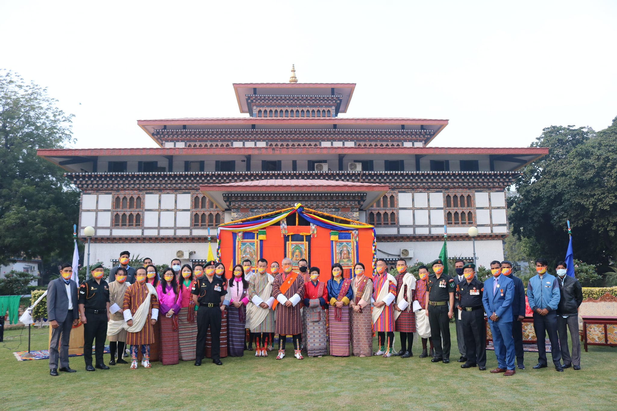 The Royal Bhutanese Embassy in New Delhi joined the nation in celebrating the 113th National Day of Bhutan at the RBE premises. The celebration commenced at 0745hrs with the lighting of butter lamps and hoisting of the National flag, singing of the National Anthem and offering of Zhabten for the long-life and well-being of His Majesty The King. The Royal Bhutanese Army stationed at the Royal Bhutanese Embassy also presented a Guard of Honour.