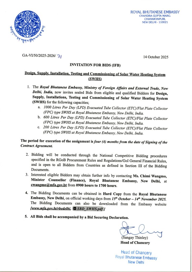 Invitation of BIDS for Solar Water Heating System