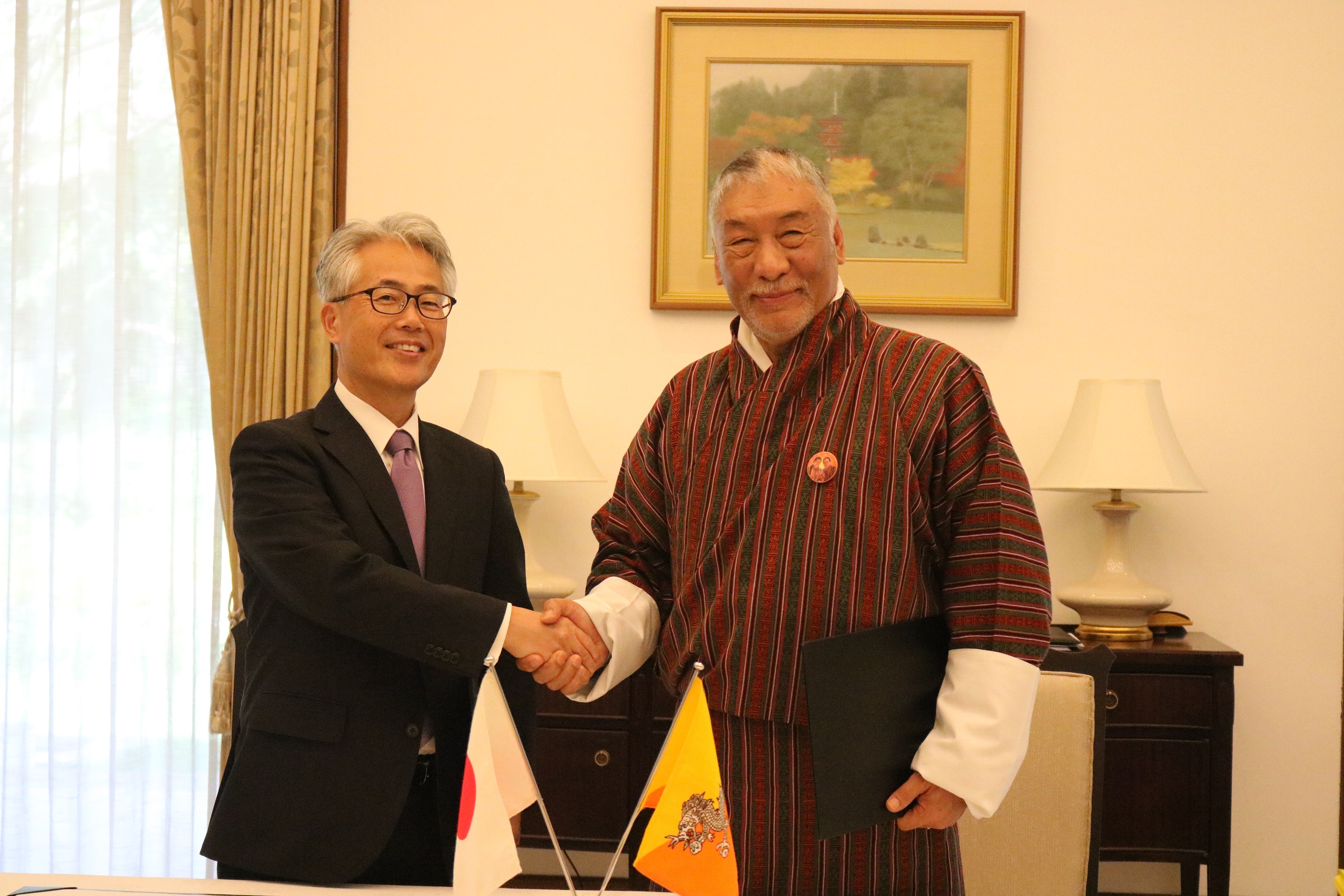 Signing Ceremony of Grant Contracts under the Grant Assistant for Grassroots Project (GGPs) between Ambassador of Bhutan to Japan V. Namgyel and Ambassador of Japan to Bhutan Satoshi Suzuki on 09 March 2020 in New Delhi.