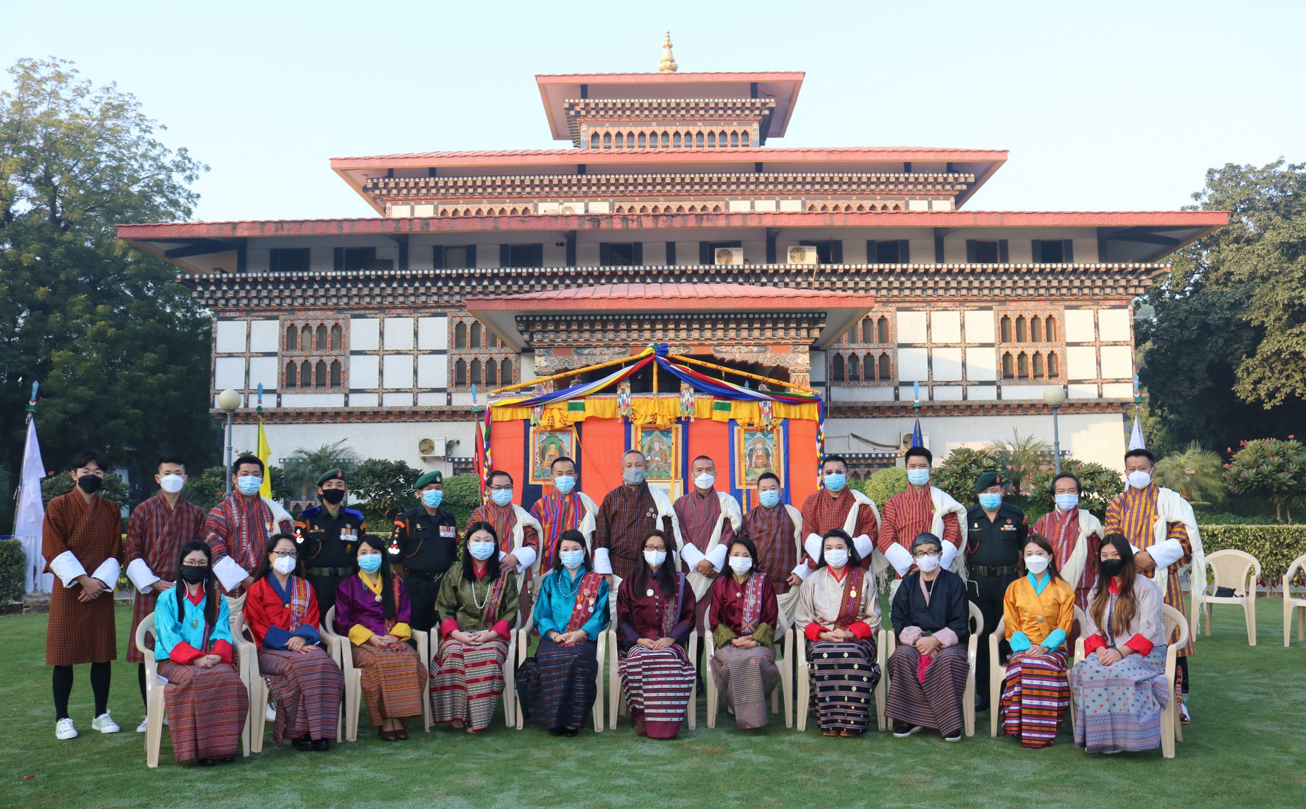 The Royal Bhutanese Embassy (RBE) in New Delhi joined the nation in celebrating the joyous occasion of the 114th National Day of Bhutan at the RBE premises. The celebration commenced with the lighting of butter lamps and hoisting of the National flag, singing of the National Anthem and offering of Zhabten for the long-life and well-being of His Majesty The King. The Royal Bhutanese Army stationed at the RBE also presented a Guard of Honour.