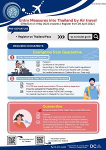 - Register for Thailand Pass (Link: https://tp.consular.go.th ) by submitting the required documents such as Passport copy, Vaccination Certificate and Medical Insurance.