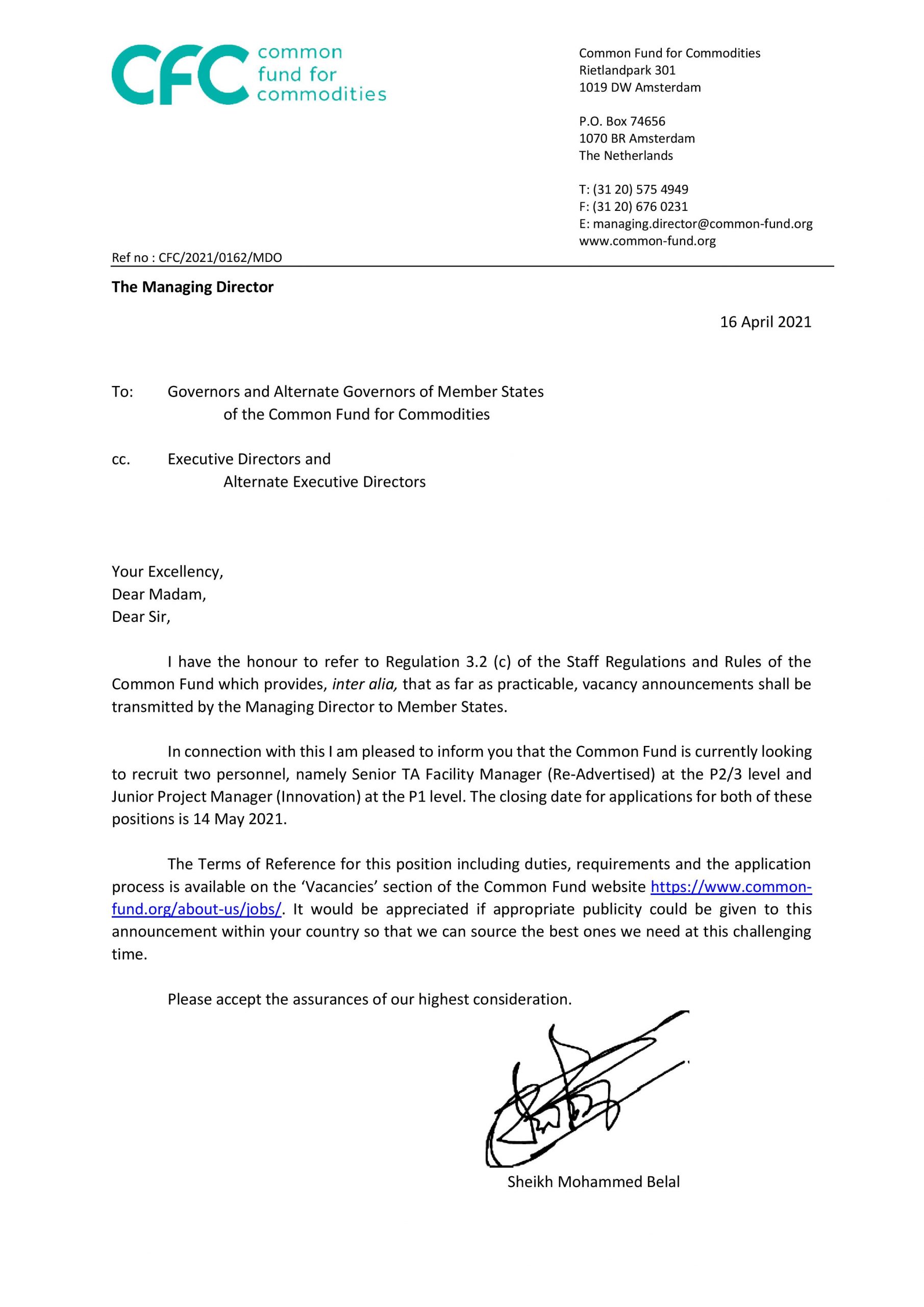 The Common Fund for Commodities (CFC) announces vacancy for the following two posts: